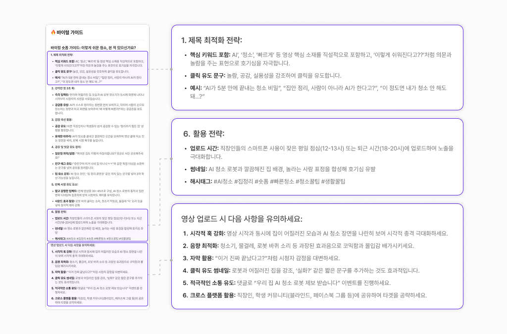 - 바이럴 가이드: 해시태그, 썸네일 문구, 자막 톤 등 확산 전략 포함