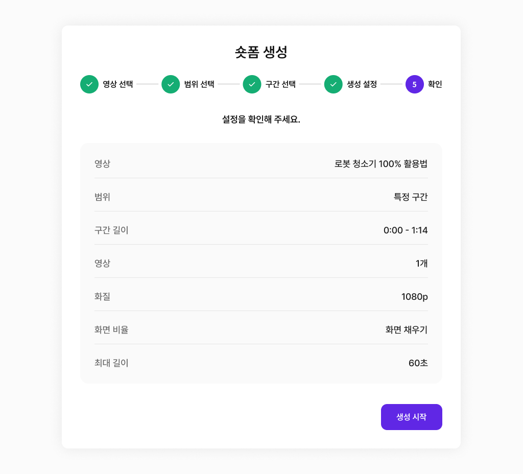 - 숏폼 길이: 15초, 30초, 1분 등 원하는 시간 직접 설정
