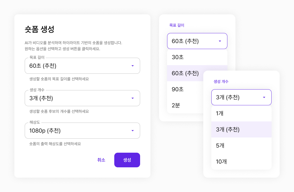 | 결과물 생성 제어 | 자동 생성 중심 (사용자 설정 제한) | 자동 생성 중심 (사용자 설정 제한) | 생성할 숏폼의 길이·개수·화면 비율 등 직접 설정 가능 |