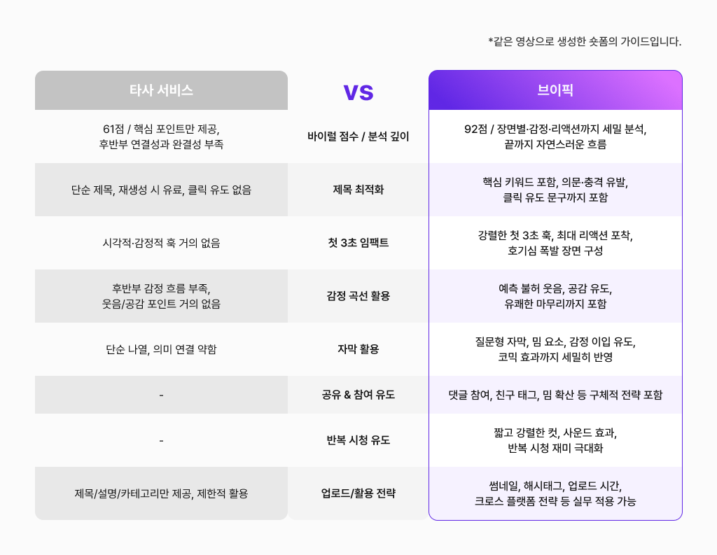 | AI 가이드 | 영상 요약·스크립트 중심 가이드 제공 | 영상 설명 수준의 가이드 제공 | 제목·해시태그·업로드 전략까지 포함한 AI 바이럴 가이드 제공 |