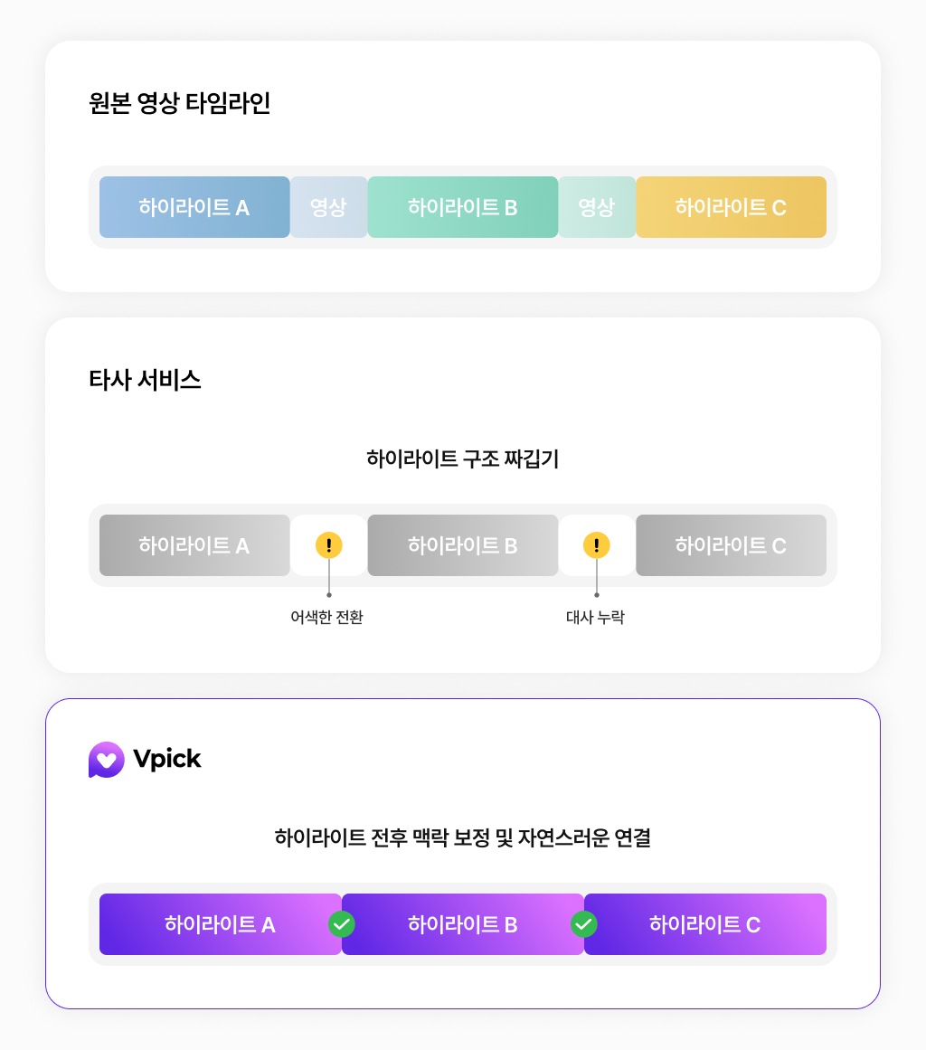 다른 툴은 여러 장면을 짜깁기해 전환이 어색해지지만, 브이픽은 하이라이트 하나를 중심으로 앞뒤 장면을 연결해 자연스러운 흐름을 유지합니다.