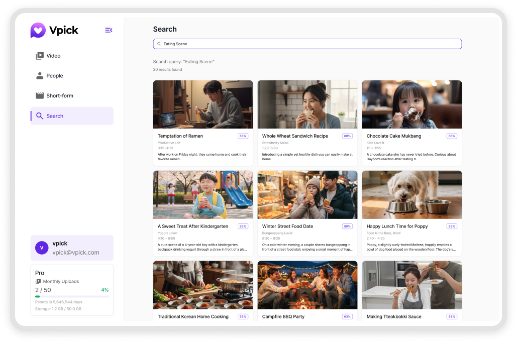 검색된 장면은 썸네일·설명·정확도와 함께