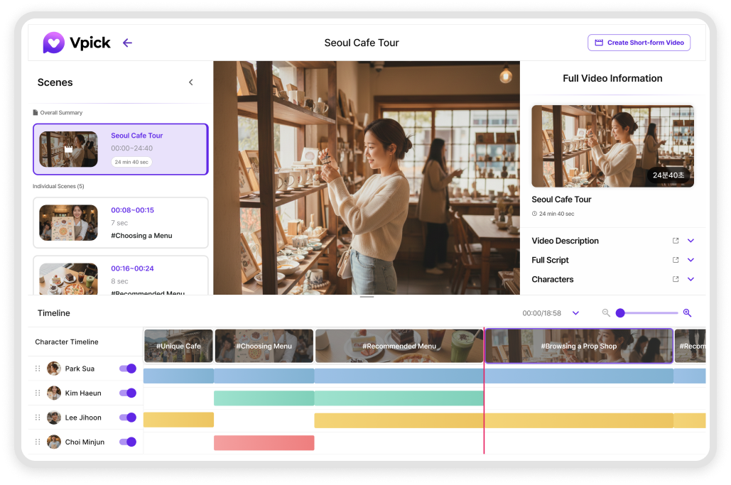 각 장면의 등장 인물을 자동으로 감지해 정리해줘요. 특정 인물 중심으로 장면을 찾을 때 바로 활용할 수 있어요.
