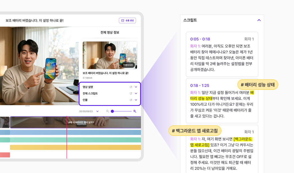 브이픽에 영상을 업로드하면 오디오가 텍스트 스크립트로 자동 변환됩니다. 이 스크립트에는 사용자가 검색할 만한 핵심 키워드들이 자연스럽게 포함되어 있습니다.